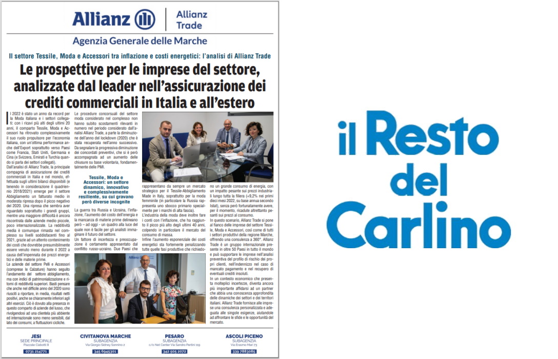 In questo scenario, Allianz Trade si pone al fianco delle imprese del settore Tessile, Moda e Accessori, così come di tutti i settori produttivi della regione Marche, offrendo una consulenza a 360°. Allianz Trade è un gruppo internazionale presente in oltre 50 Paesi in tutto il mondo e può supportare le imprese nell’analisi preventiva del profilo di rischio dei propri clienti, nell’indennizzo nel caso di mancato pagamento e nel recupero di eventuali crediti insoluti.